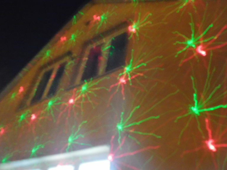 Fronton naszego budynku wieczorową porą ozdabiają świecące się wzory.