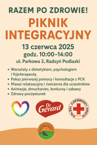 Już jutro tj 13.06.2025 (piątek) w godz. 10.00 -14.00 zapraszamy na Piknik Integracyjny Razem po Zdrowie w siedzibie stowarzyszenia ul. Parkowa 2.